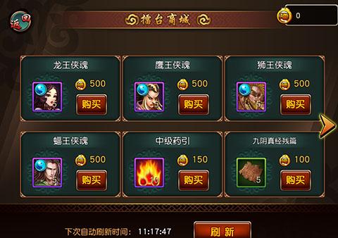 商店刷新:每天21点刷新(消耗10个擂台奖章可手动刷新)。